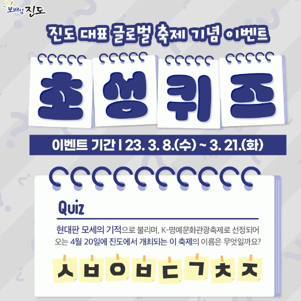 Ãʼº ÄûÁî´Â Çö´ëÆÇ ¸ð¼¼ÀÇ ±âÀûÀ¸·Î ºÒ¸®¸ç, K-¸í¿¹¹®È°ü±¤ÃàÁ¦·Î ¼±Á¤µÇ¾î ¿À´Â 4¿ù 20ÀϺÎÅÍ Áøµµ±º¿¡¼ °³ÃֵǴ ÃàÁ¦ÀÇ À̸§À» ¸ÂÃß¸é µÈ´Ù.