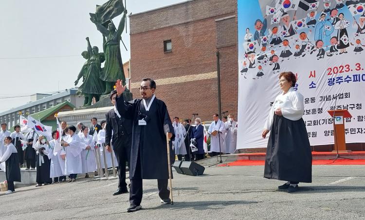 ÀÓÇüÅà ±³¼ö´Â À̳¯ ½Ã¹Î°Å¸®±Ø ¡®3¡¤1¸¸¼¼¿îµ¿ÀÇ ºÒ¾¾°¡ µÇ¾î¡¯ °ø¿¬¿¡¼ ¿À¹æ ÃÖÈïÁ¾ ¸ñ»ç·Î ºÐÀåÇØ ±¤ÁÖ¿¡¼ ¸¸¼¼¿îµ¿ÀÇ ÁÖµµÀûÀÎ ¿ªÇÒÀ» ´ã´çÇß´ø 1919³â ´ç½Ã ÃÖ ¸ñ»çÀÇ »îÀ» ÀçÇöÇß´Ù. ÀÓ ±³¼ö´Â ÀÌ¾î ±¤ÁÖ3¡¤1¿îµ¿±â³ä µ¿»ó¿¡¼ºÎÅÍ ºÎµ¿±³±îÁö 1½Ã°£ 20¿©ºÐ°£ ¸¸¼¼ÇàÁøÀ» ¹úÀÌ¸ç ¼±¿µéÀÇ °í±ÍÇÑ Èñ»ý°ú ¹ÎÁ·ÁöÁ¸ÀÇ Á¤½ÅÀ» ½Ã¹Îµé¿¡°Ô ÀüÆÄÇß´Ù.