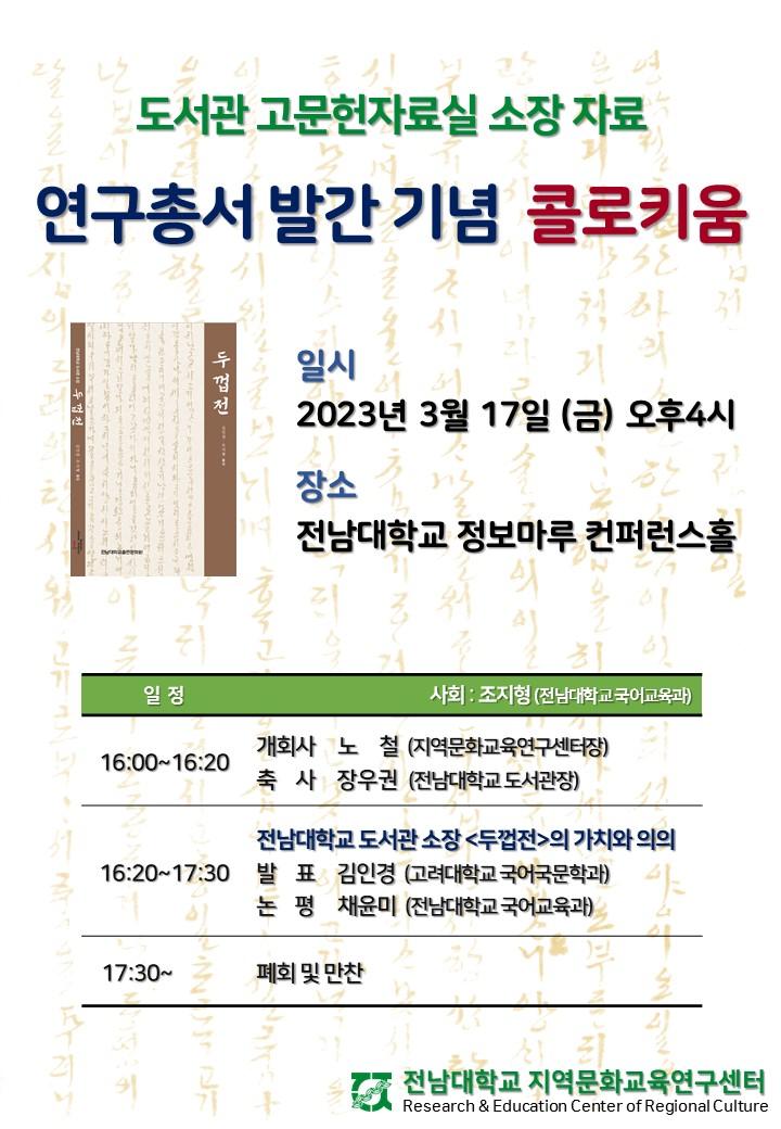 Áö¿ª¹®È±³À°¿¬±¸¼¾ÅÍ(¼¾ÅÍÀå ³ëö)´Â Àü³²´ë µµ¼°ü °í¹®ÇåÀÚ·á½Ç¿¡ ¼ÒÀåµÈ Çѱ¹ÇÐ °ü·Ã °íÀü ÀÚ·áµé Áß ÇмúÀû °¡Ä¡°¡ ³ôÀº ÀÚ·áµéÀ» ¼±Á¤ÇØ ÇØÁ¦, ¿ªÁÖ, ¿µÀÎ ÀÛ¾÷À» °ÅÄ£ ¿¬±¸¼¸¦ ¹ß°£Çϰí ÀÖ´Ù. À̹ø ÄÝ·ÎŰ¿òÀº ±× ù ¹øÂ° ¿¬±¸¼·Î <µÎ²®Àü>À» ¹ß°£ÇÑ µ¥ µû¸¥ ¼º°ú¸¦ °øÀ¯Çϱâ À§ÇÑ °ÍÀÌ´Ù.