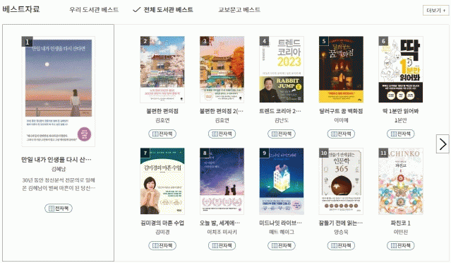 ÃÖ±Ù¿¡´Â »õ·Î Ãâ°£µÈ µµ¼¸¦ ÀüÀÚÃ¥À¸·Î ¸¸³ª º¼ ¼ö ÀÖµµ·Ï ±¸µ¶Çü ÀüÀÚÃ¥ 6¸¸¿©Á¡À» µµÀÔÇß´Ù. À̸¦ ÅëÇØ ÇöÀç º£½ºÆ®¼¿·¯ µµ¼¡¸ºÒÆíÇÑ ÆíÀÇÁ¡¡¹¡¸´Þ·¯±¸Æ® ²Þ ¹éÈÁ¡¡¹¡¸ÆÄÄ£ÄÚ¡¹µî ÃֽŠÃâÆÇ µµ¼¸¦ ¹Ù·Î ¸¸³ª º¼ ¼ö ÀÖµµ·Ï Çϰí ÀÖ´Ù.