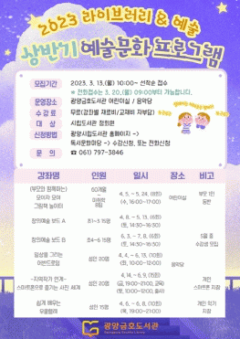 ¼ö°·á´Â ¹«·áÀ̸ç, °Áº° Àç·áºñ¿Í ±³Àçºñ´Â ÀںδãÀÌ´Ù. »ó¹Ý±â ¿¹¼ú¡¤¹®ÈÇÁ·Î±×·¥ ¼ö°»ýÀº 13ÀÏ ¿ÀÀü 10½ÃºÎÅÍ ¼±Âø¼øÀ¸·Î ¸ðÁý ÁßÀ̸ç, ±¤¾ç½Ã¸³µµ¼°ü ȨÆäÀÌÁö¿¡¼ ½ÅûÇÒ ¼ö ÀÖ´Ù.