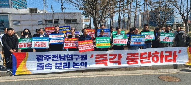 ÀÌÀçÅ ÀÇ¿øÀº ¡®±¤ÁÖÀü³²¿¬±¸¿ø ºÐ¸® ¹Ý´ë Ã˱¸´ëȸ °áÀǹ®¡¯À» ÅëÇØ ¡°±¤ÁÖ½Ã¿Í Àü³²µµÀÇ ¡®»ó»ý¹ßÀü 1È£¡¯·Î Æò°¡¹Þ´Â ±¤ÁÖÀü³²¿¬±¸¿øÀÇ ºÐ¸® ½Ãµµ´Â ´ë´ÜÈ÷ ¹«Ã¥ÀÓÇÏ°í ±Ù½Ã¾ÈÀûÀÎ ¹ÌºÀÃ¥ÀÌ´Ù¡±¸ç ¡°¿¬±¸¿øÀÇ ¿ªÇÒÀÌ ¹ÌÈíÇÏ´Ù¸é ºÐ¸®°¡ ¾Æ´Ï¶ó Àη°ú ¿¹»êÁö¿øÀ» ´Ã·Á ¿¬±¸¿øÀÇ ¿ª·®À» Ű¿ì´Â °ÍÀÌ ÇÊ¿äÇÏ´Ù¡±°í ¸»Çß´Ù.