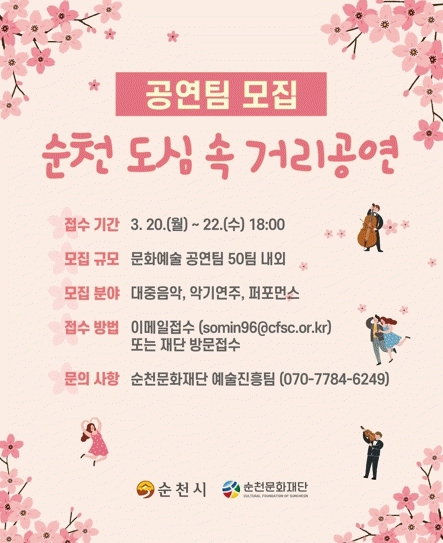 ÃÖÁ¾ ¼±Á¤µÈ °ø¿¬ÆÀÀº ÁýÁß ¿î¿µ ±â°£ÀÎ 4¿ù°ú 5¿ù ¹®ÈÀǰŸ®, ¼øÃµ¿ª, Á¶·ÊÈ£¼ö°ø¿ø µî µµ½É ÀÏ¿ø¿¡¼ ½Ã¹Îµé°ú ¿¹¼úÀÎ, ±×¸®°í °ü±¤°´ÀÌ Âü¿©Çϰí ÇÔ²² ÇÒ ¼ö ÀÖ´Â ¹®È¿¹¼ú °ø¿¬À» ¼±º¸ÀÏ ¿¹Á¤ÀÌ´Ù.