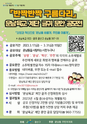 °ø¸ð ±â°£Àº 31ÀϱîÁö·Î, ¿î³²µ¿À» »ç¶ûÇÏ´Â ½Ã¹Î ´©±¸³ª Âü¿©ÇÒ ¼ö ÀÖ´Ù. ¡®»ó»ý°ú Çõ½ÅÀ¸·Î ¡®¿î³²À» »õ·Ó°Ô, ÁÖ¹ÎÀ» ÀÌ·Ó°Ô¡¯ Ç¥¾î¸¦ Áß½ÉÀ¸·Î ¡®»ó»ý¡¯, ¡®¿î³²¡¯, ¡®Çõ½Å¡¯, ¡®ÁֹΡ¯ µî ¿¼í¸»À» Ȱ¿ëÇØ »õ·Î¿î Èñ¸Á°ú ÇູÀ» ÀüÇÏ´Â ±Û±Í¸¦ 15ÀÚ À̳»·Î ÀÚÀ¯·Ó°Ô Ç¥ÇöÇÏ¸é µÈ´Ù.