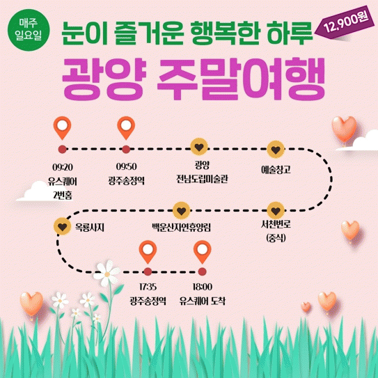±¤¾çÁÖ¸»¿©ÇàÀº ¸ÅÁÖ ÀÏ¿äÀÏ ±¤ÁÖ À¯½ºÄù¾î(¿ÀÀü 9½Ã 20ºÐ)¸¦ Ãâ¹ßÇØ ±¤ÁÖ¼ÛÁ¤¿ª(9½Ã 50ºÐ)À» °æÀ¯ÇÏ¿© ±¤¾ç ¿øµµ½ÉÀÇ Àü³²µµ¸³¹Ì¼ú°ü, ±¤¾ç¿¹¼úâ°í µîÀ» °ü¶÷ÇÑ´Ù.