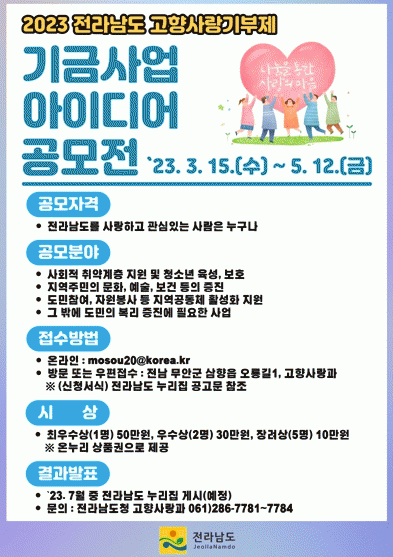 °ø¸ð Á¦¾È¼´Â Àü³²µµÃ» µµ¹Îµ¿ 3Ãþ °íÇâ»ç¶û°ú·Î ¹æ¹®Çϰųª ¿ìÆí, ÀüÀÚ¿ìÆí µîÀ¸·Î Á¦ÃâÇÏ¸é µÈ´Ù. °ø¸ð °ü·Ã ÀÚ¼¼ÇÑ »çÇ×Àº Àü³²µµ ´ëÇ¥ ´©¸®Áý °í½Ã°ø°í¸¦ ÅëÇØ È®ÀÎÇÒ ¼ö ÀÖ´Ù.