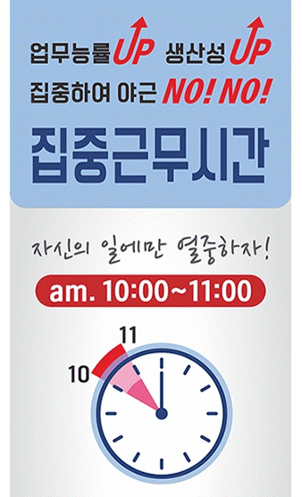 ÁýÁß±Ù¹«½Ã°£Á¦´Â ¾÷¹« ÁýÁßµµ°¡ °¡Àå ³ôÀº ½Ã°£´ë¿¡ ¾÷¹« ¿ÜÀûÀÎ ¿ä¼Ò¿¡ ¹æÇعÞÁö ¾Ê°í ¹Ðµµ ÀÖ°Ô ÀÏÇÔÀ¸·Î½á ¾÷¹« È¿À²¼ºÀ» ±Ø´ëÈÇϱâ À§ÇØ ÃßÁøÇÏ°Ô µÆ´Ù. ÁýÁß±Ù¹«½Ã°£Á¦´Â ¾÷¹«ÀÇ ¸ôÀÔÀ» ³ô¿© °üÇàÀûÀÎ Ãʰú±Ù¹«¸¦ ÁÙÀÓÀ¸·Î½á Àϰú °¡Á¤ÀÇ ¾ç¸³ È®»ê°ú ¡°ÀÏÇÒ ¶§ ÁýÁßÀûÀ¸·Î ÀÏÇϰí, ½¯ ¶§ Á¦´ë·Î ½¬´Â¡± ±Ù¹« ¹®È¸¦ Á¤ÂøÇϱâ·Î Çß´Ù.