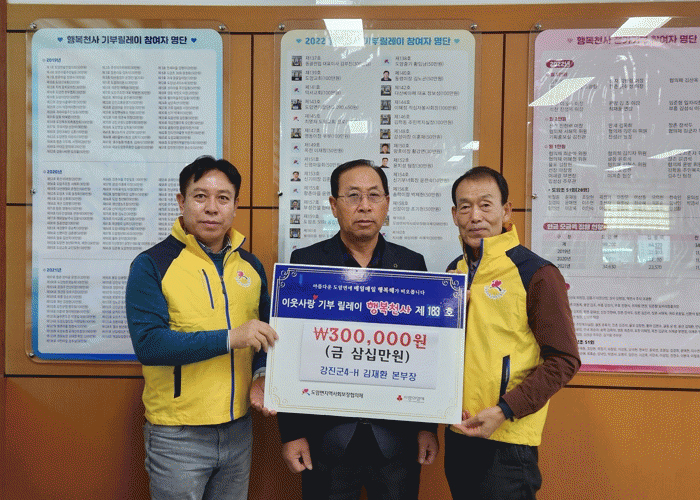 ¶Ç, Áö³ 14ÀÏ¿¡´Â °Áø±º 4-H ±èÀçȯ º»ºÎÀåÀÌ µµ¾Ï¸é»ç¹«¼Ò¸¦ ¹æ¹®ÇØ ¼º±Ý 30¸¸ ¿ø, Áö³ 20ÀÏ¿¡´Â ½Å±â¸¶À» ±èÁØÈ£ ÀÌÀå°ú À±Âù¼÷ ºÎ³àȸÀåÀÌ °¢°¢ 20¸¸ ¿ø°ú 10¸¸ ¿øÀ» ±âŹÇÏ¸ç µµ¾Ï¸é ¡®ÀÌ¿ô»ç¶û Çູõ»ç ±âºÎ¸±·¹ÀÌ¡¯¿¡ µ¿ÂüÇß´Ù.