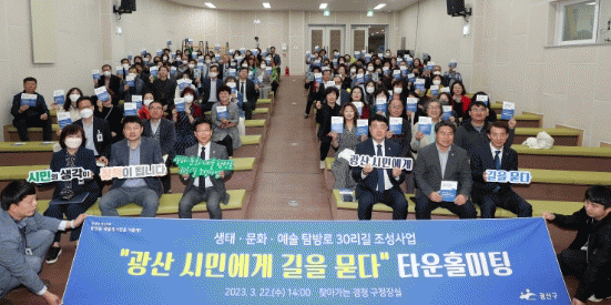 µµ»ê?¼ÛÁ¤?½ÅÈï?¾î·æµ¿ µî Áö¿ªÁÖ¹ÎÀº ¹°·Ð Æ®·¹Å·?ÀÚÀü°Å µ¿È£ÀÎ µî 100¿© ¸íÀÌ Âü¿©ÇÑ °¡¿îµ¥, ±¤»ê±¸ÀÇ ¸íǰ 30¸®±æ Á¶¼º ÃßÁø °èȹÀ» °øÀ¯Çϰí, ÀÌ¿¡ ´ëÇØ ÀÚÀ¯·Ó°Ô Àǰ߰ú Á¦¾ÈÀ» ³ª´©´Â ½Ã°£ÀÌ ¸¶·ÃµÆ´Ù.