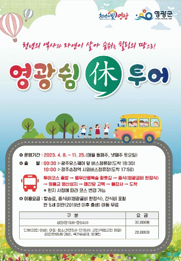 Åõ¾î´Â ¿ÜºÎ °ü±¤°´À» ´ë»óÀ¸·Î 4¿ù 8ÀϺÎÅÍ 11¿ù 25ÀϱîÁö ¸Å¿ù µÑ°ÁÖ, ³Ý°ÁÖ Åä¿äÀÏ 16ȸ ¿î¿µÇÏ¸ç ±¤ÁÖ À¯½ºÄù¾î(¹ö½ºÅ͹̳Î) ¾Õ ¹ö½ºÁ¤·ùÀå 9½Ã 30ºÐ, ±¤ÁÖ ¼ÛÁ¤¿ª ½Ã¿Ü¹ö½º Á¤·ùÀå¿¡¼ 10½Ã¿¡ Ãâ¹ßÇÑ´Ù. ÄÚ½º´Â ¹°¹«»êÇູ½£ ȲÅê±æ, ¿øºÒ±³ ¿µ»ê¼ºÁö, ¸Å°£´ç °íÅÃ, ºÒ°©»ç µî õ³âÀÇ ¿ª»ç¡¤¹®È¡¤ÀÚ¿¬°ú ÇÔ²² ÁöÄ£ ÀÏ»óÀ» ³»·Á³õ°í Àá½Ã ½¬¾î°¥ ¼ö ÀÖ´Â Èú¸µÄÚ½º·Î ¿î¿µµÇ¸ç, Áß½ÄÀº ¿µ±¤±¼ºñ ÇÑÁ¤½ÄÀ¸·Î Á¦°øµÇ¾î ¿µ±¤ÀÇ ¸Àµµ ´À²¸º¼ ¼ö ÀÖ´Ù.