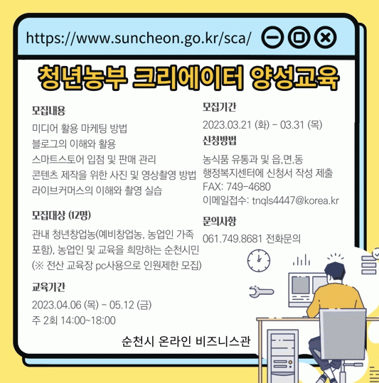 ½Åû ÀÚ°ÝÀº °ü³» û³ââ¾÷³ó(¿¹ºñâ¾÷³ó, ³ó¾÷ÀÎ °¡Á· Æ÷ÇÔ), ³ó¾÷ÀÎ ¹× ±³À°À» Èñ¸ÁÇÏ´Â ¼øÃµ½Ã¹ÎÀÌ¸ç ¸ðÁý ¿ä°Ç¿¡ ÃæÁ·ÇÏ´Â ÀÚ Áß ¼øÀ§Á¦·Î 12¸íÀ» ¼±¹ßÇÑ´Ù. °ü·Ã Á¤º¸´Â ¼øÃµ½Ãû ¶Ç´Â ¼øÃµ½Ã ³ó¾÷±â¼ú¼¾ÅÍ ´©¸®Áý¿¡¼ È®ÀÎÇÒ ¼ö ÀÖ´Ù.