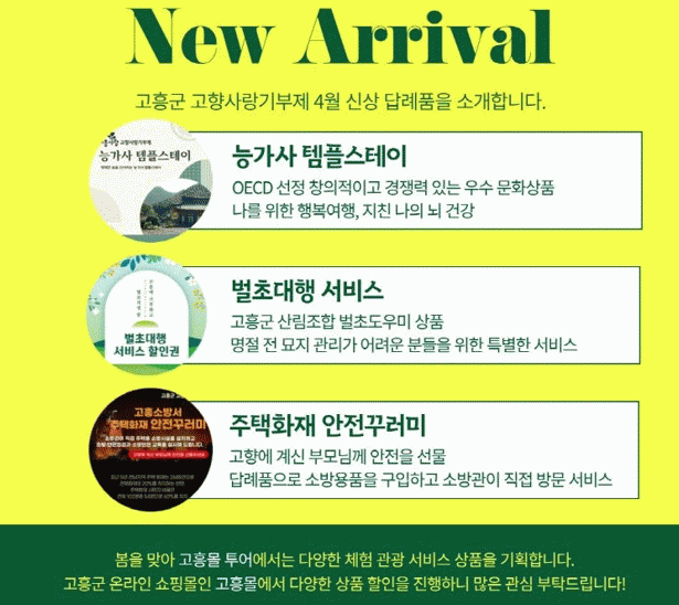 °íÈﱺÀº ´ä·ÊǰÀ¸·Î ÇÑ¿ì, À¯ÀÚ, ¼®·ù, ¹Ý°ÇÁ¶ »ý¼±, ½Ò µî ûÁ¤³ó¼öÃà»êǰ 380¿©Á¾°ú °íÈï»ç¶û»óǰ±Ç, ºÐû»ç±â¸¦ Á¦°øÇϰí ÀÖÀ¸¸ç, À̹ø ½Å±Ô ´ä·ÊǰÀÎ ´É°¡»ç ÅÛÇýºÅ×ÀÌ, ¹úÃÊ´ëÇ༺ñ½º, ÁÖÅÃÈÀç¾ÈÀü²Ù·¯¹Ìµµ 4¿ùºÎÅÍ º»°Ý Á¦°øÇÒ ¿¹Á¤ÀÌ´Ù.