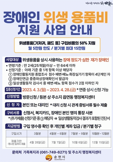 ½Ã´Â À§»ý¿ëǰ ±¸ÀÔºñÀÇ 50%¸¦ ¸Å´Þ 5¸¸ ¿ø Çѵµ ³»¿¡¼ ºÐ±âº° ÇÕ»ê Áö¿øÇÑ´Ù. ÁýÁß ½Åû ±â°£ÀÎ 4¿ùÀ» ½ÃÀÛÀ¸·Î ´ë»óÀÚ¸¦ ¿¬Áß ¸ðÁýÇÑ´Ù.