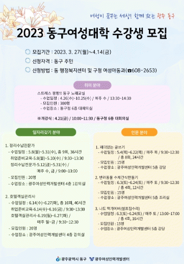 ¿ÃÇØ µ¿±¸ ¿©¼º´ëÇÐ °³¼³ °Á´ ¡ãÃë¹Ì(½ºÆ®·¹½º ÆÎÆÎ! µ¿±¸ ³ë·¡±³½Ç) ¡ãÀι®(Àç¹ÌÀÖ´Â ±Û¾²±â¡¤¹Ý·Áµ¿¹° ¼öÁ¦ °£½Ä ¸¸µé±â¡¤³ªµµ ¸Æ°¡À̹ö Áý¼ö¸® ±³À°) ¡ã¹Ù·Î ÀÏÀÚ¸® °®±â(È£ÅÚ °´½Ç °ü¸®»ç¡¤Á¤¸®¼ö³³ Àü¹®°¡ 2±Þ) µî 3°³ ºÐ¾ß 6°³ °úÁ¤ÀÌ´Ù.