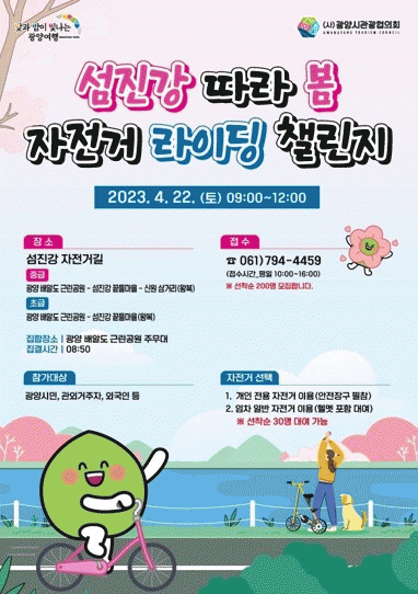 ±¤¾ç½Ã°¡ ±¤¾ç½Ã°ü±¤ÇùÀÇȸ ÁÖ°üÀ¸·Î ¿À´Â 22ÀÏ ¿ÀÀü 9½Ã, ¼¶Áø°ÀÚÀü°Å±æ¿¡¼ ¡®¼¶Áø° µû¶ó º½ ÀÚÀü°Å ¶óÀ̵ù 縰Áö¡¯¸¦ ÃßÁøÇÑ´Ù°í ¹àÇû´Ù.