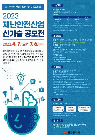 °ø¸ð ÁÖÁ¦´Â »ýȰ¾ÈÀü?¹æÀç?¼Ò¹æ µî Àç³¾ÈÀü»ê¾÷ Àü¹ÝÀ̸ç, Âü°¡´ë»óÀº ±¤ÁÖÁö¿ª ¼ÒÀç ±â¾÷, ¿¹ºñâ¾÷ÀÚ, ¿¬±¸±â°ü, ´ëÇÐ ¶Ç´Â °³ÀÎ µîÀÌ´Ù. ¿À´Â 7¿ù 6ÀϱîÁö ±¤Áֽà ȨÆäÀÌÁö¸¦ ÅëÇÑ ¿Â¶óÀÎ ¶Ç´Â µî±â¿ìÆí Á¢¼ö°¡ ÁøÇàµÇ¸ç ÀÚ¼¼ÇÑ »çÇ×Àº ½Ã ȨÆäÀÌÁö¿¡¼ È®ÀÎÇÒ ¼ö ÀÖ´Ù.