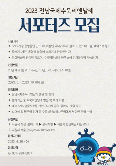 ¼±¹ßµÈ ¼Æ÷ÅÍÁî´Â ¿À´Â 5¿ùºÎÅÍ 6°³¿ù°£ ¡®2023 Àü³²±¹Á¦¼ö¹¬ºñ¿£³¯·¹¡¯ ÁÖ¿ä ¼Ò½ÄÀ» ºí·Î±×, ÆäÀ̽ººÏ, ÀνºÅ¸±×·¥ µî »çȸ°ü°è¸Á(SNS)¿¡ °Ô½ÃÇϴ Ȱµ¿À» ÇÏ°Ô µÈ´Ù.