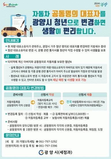 À̰±â ¼¼Á¤°úÀåÀº ¡°±¤¾ç½Ã °ÅÁÖ Ã»³â ¸íÀÇ·Î Â÷·® ´ëÇ¥ÀÚ¸¦ º¯°æÇϸé ü³³ ¿¹¹æ°ú »ç»ýȰµµ º¸È£¹ÞÀ» ¼ö ÀÖ¾î ¸¹Àº ½Ã¹ÎµéÀÇ Âü¿©¸¦ ºÎʵ台´Ù¡±¸ç ¡°¾ÕÀ¸·Îµµ ³³¼¼ÀÚ ÆíÀÇ¿¡ ÃÖ¼±À» ´ÙÇϰڴ١±°í ¸»Çß´Ù.