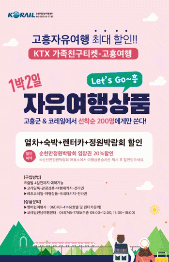 ¡®Let`s Go~Èï 1¹Ú2ÀÏ ÀÚÀ¯¿©Ç࡯ »óǰÀº ¼±Âø¼ø 200¸í¿¡°Ô¸¸ ÆÇ¸ÅµÇ¸ç, °íÈﱺÀÌ 1Àδç 5¸¸¿øÀÇ ¿©Çàºñ¿ëÀ» Áö¿øÇϰí ÄÚ·¹ÀÏ¿¡¼´Â KTX ¿îÀÓ ÇÒÀÎ µîÀ» Áö¿øÇØ ¿Â÷, ¼÷¹Ú, ·»ÅÍÄ«, ¼øÃµ¸¸Á¤¿ø¹Ú¶÷ȸ ÇÒÀÎÀÌ °áÇÕµÈ °íÈï¿©Çà»óǰÀ» ÃÊÆ¯°¡·Î ÀÌ¿ëÇÒ ¼ö ÀÖ´Ù.
