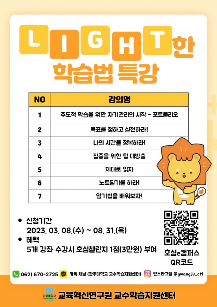 [ÅåÅå´º½º]±¤ÁÖ´ëÇб³(ÃÑÀå ±èµ¿Áø) ±³À°Çõ½Å¿¬±¸¿ø ±³¼öÇнÀÁö¿ø¼¾ÅÍ´Â ÀçÇлýµé¿¡°Ô ´Ù¾çÇÑ ÇнÀÀü·«À» Á¦°øÇϱâ À§ÇØ ¿À´Â 8¿ù 31ÀϱîÁö ¡®LIGHTÇÑ ÇнÀ¹ý Ư°¡¯À» ÁøÇàÇÑ´Ù.