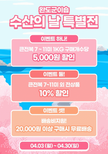Ưº°Àü´Â 4¿ù 3ÀϺÎÅÍ 4¿ù 30ÀϱîÁö ÁøÇàµÇ¸ç, ¿Ïµµ±º ¿Â¶óÀÎ ¼îÇθôÀÎ ¡®¿Ïµµ±ºÀÌ¼ó¡¯ ±âȹ°ü¿¡¼ Å« Àüº¹(7~11¹Ì, 1kg)À» ±¸ÀÔ ½Ã °Ç´ç 5000¿ø ÇÒÀÎÄíÆù°ú 20,000¿ø ÀÌ»ó »óǰÀ» ±¸¸ÅÇÏ¸é ¹«·á ¹è¼Û À̺¥Æ®¸¦ ¼±Âø¼øÀ¸·Î ÁøÇàÇÑ´Ù.