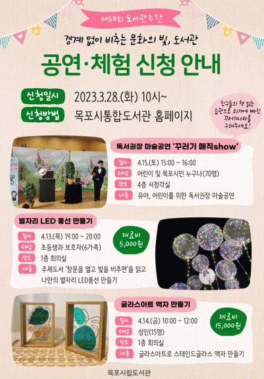 ¸ñÆ÷½Ã¸³µµ¼°üÀº À¯¾Æ ¹× ¾î¸°À̵éÀÇ Ã¥Àд ½À°üÀ» ±æ·¯ÁÖ±â À§ÇÑ µ¶¼±ÇÀå ¸¶¼ú°ø¿¬ ¡®²Ù·¯±â ¸ÅÁ÷show¡¯, ¾î¸°ÀÌ¿Í º¸È£ÀÚ°¡ ÇÔ²²ÇÏ´Â ¡®º°ÀÚ¸® LEDdz¼± ¸¸µé±â¡¯, ¼ºÀÎ ´ë»ó ¡®±Û¶ó½º¾ÆÆ® ¾×ÀÚ ¸¸µé±â¡¯, µµ¼ ¡®ÃãÃß´Â ¹éÁ¶¡¯ ¿øÈ Àü½Ã,¸¦ ÁøÇàÇÑ´Ù.