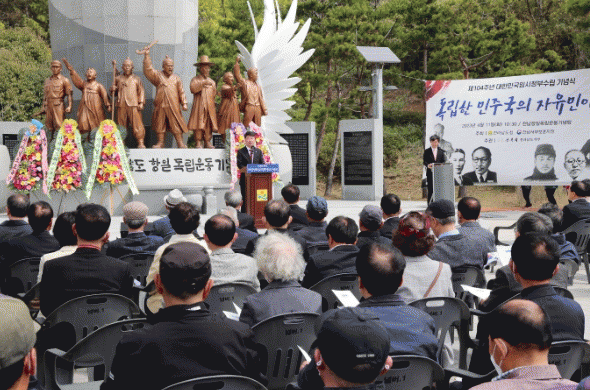 ¹Úâȯ ºÎÁö»ç´Â ±â³ä»ç¿¡¼ ¡°´ëÇѹα¹ ÀÓ½ÃÁ¤ºÎ´Â ´ëÇÑ µ¶¸³ Á¤´ç¼ºÀ» ¼¼°è¿¡ ³Î¸® ¾Ë¸®°í Ç×ÀÏ ¹«ÀåÅõÀïÀ» Ȱ¹ßÇÏ°Ô Àü°³ÇÏ¸ç ±¤º¹Çϱâ±îÁö µ¶¸³¿îµ¿ÀÇ µçµçÇÑ ±¸½ÉÁ¡ ¿ªÇÒÀ» Çß´Ù¡±¸é¼ ¡°Àü³²Àº ÀÓ½ÃÁ¤ºÎÀÇ ÀÚÁÖ µ¶¸³Á¤½ÅÀ» µÇ»ì·Á ¡®¼¼°è·Î ¿õºñÇÏ´Â »ý¸íÀÇ ¶¥ À¸¶ä Àü³²¡¯À» ¸¸µé°Ú´Ù¡±°í ¸»Çß´Ù.