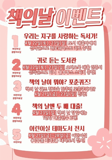 ¡®¼¼°è Ã¥ÀÇ ³¯¡¯ÀÎ 23ÀÏ¿¡´Â 1ÀÎ´ç ´ëÃ⠱Ǽö¸¦ µÎ ¹è·Î ´Ã·ÁÁÖ´Â Çà»ç¸¦ ÅëÇØ ½Ã¹Îµé¿¡°Ô Ã¥ÀÇ ³¯À» È«º¸ÇÏ°í µµ¼°üÀ» ã´Â Áñ°Å¿òÀ» ÀüÇϰíÀÚ ÇÑ´Ù.