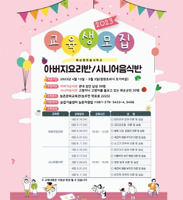 ¸ðÁý°úÁ¤Àº 2°³ °úÁ¤À¸·Î ¾Æ¹öÁö¿ä¸®¹Ý, ½Ã´Ï¾îÀ½½Ä¹Ý ±³À°ÀÌ´Ù. ±³À°Àº 5¿ù 10ÀÏ °³°ÇÏ¿© 6¿ù 7ÀϱîÁö ¸ÅÁÖ ¼ö¿äÀÏ, ÃÑ 5ȸ·Î ±³À°ºñ¿Í Àç·áºñ ¸ðµÎ ¹«·á·Î ÁøÇàµÈ´Ù.