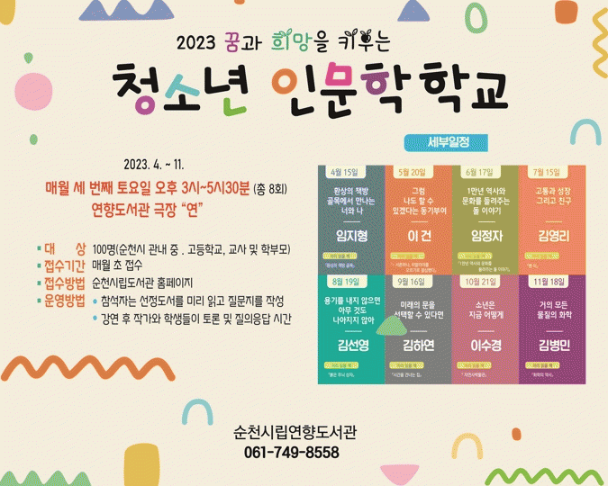 û¼Ò³â Àι®ÇÐÇб³´Â û¼Ò³â ´©±¸³ª Âü¿©ÇÒ ¼ö ÀÖÀ¸¸ç, ÀÚ¼¼ÇÑ »çÇ×Àº ¼øÃµ½Ã¸³µµ¼°ü ´©¸®ÁýÀ» È®ÀÎÇϰųª ¼øÃµ½Ã¸³¿¬Çâµµ¼°üÀ¸·Î ¹®ÀÇÇÏ¸é µÈ´Ù.