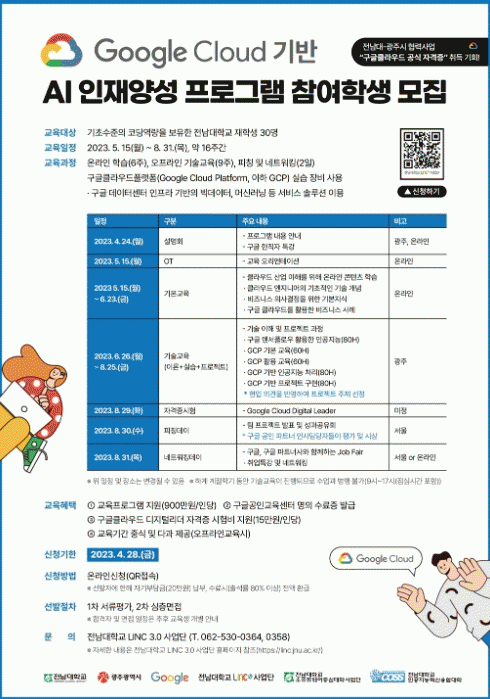 ±¤ÁÖ±¤¿ª½Ã´Â ±¸±Û Ŭ¶ó¿ìµå ÄÚ¸®¾Æ, Àü³²´ë¿Í ÇÔ²² ¿î¿µÇÏ´Â ÀΰøÁö´É ±³À°ÇÁ·Î±×·¥ÀÎ ¡®±¸±Û Ŭ¶ó¿ìµå AI Ä·ÇÁ for Àü³²´ë¡¯ÀÇ 5¿ù °³°À» ¾ÕµÎ°í ¿À´Â 28ÀϱîÁö ±³À°»ýÀ» ¸ðÁýÇÑ´Ù.