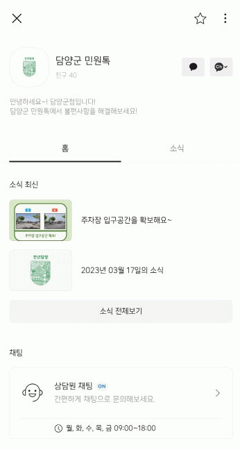 ´©±¸µçÁö īī¿ÀÅå °¡ÀÔ ÈÄ ¡®´ã¾ç±º ¹Î¿øÅ塯À» °Ë»öÇØ ä³ÎÀ» Ãß°¡Çϸé ÀÌ¿ëÇÒ ¼ö ÀÖÀ¸¸ç, µµ·ÎÆÄ¼Õ, °¡·Îµî °íÀå, ºÒ¹ý Æó±â¹° µî ÀÏ»ó ¼Ó Å©°í ÀÛÀº ¾ÈÀü°ú ºÒÆí »çÇ×À» ½±°Ô Á¦º¸ÇÒ ¼ö ÀÖ´Ù.