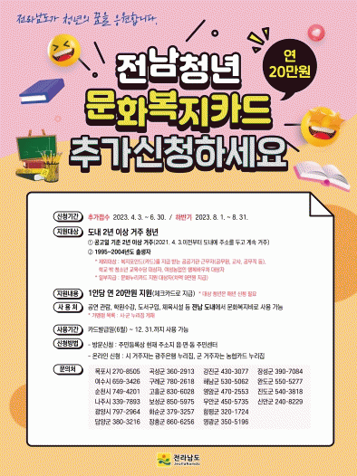 ¸ðÁý ±â°£Àº 6¿ù 30ÀϱîÁö´Ù. Áö¿ø ´ë»óÀº Àü³²¿¡ 2³â ÀÌ»ó °ÅÁÖÇϰí ÀÖ´Â 19¼¼ ÀÌ»ó 28¼¼ ÀÌÇÏ(1995~2004³â Ãâ»ýÀÚ) û³âÀÌ´Ù. 1ÀÎ´ç ¿¬ 20¸¸ ¿øÀÇ ¹®Èº¹Áöºñ¸¦ Áö¿øÇÏ¸ç ¿ÃÇØ 2¿ù ½ÅûÀÚ´Â Á¦¿ÜµÈ´Ù.