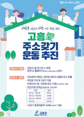 ±ºÀº °ü³» ±â°ü¤ý´Üü ¹× ±â¾÷ µîÀ» ¹æ¹®ÇØ °íÈï¿¡ °ÅÁÖÇϰí ÀÖÀ¸³ª ´Ù¸¥ Áö¿ª¿¡ ÁÖ¼Ò¸¦ µÐ ¹ÌÀüÀÔÀÚ¸¦ ´ë»óÀ¸·Î ÀüÀÔÀ» µ¶·ÁÇÏ´Â ¡®Ã£¾Æ°¡´Â ÁÖ¼ÒÀÌÀü ¼ºñ½º¡¯ µîÀ» ÃßÁøÇϸç, Ÿ ½Ã±º±¸¿¡¼ °íÈﱺÀ¸·Î 5¸í ÀÌ»ó ÀüÀÔÇÑ ±â°üÀ̳ª ±â¾÷ ´ë»óÀ¸·Î ÀüÀÔÀ¯°ø Àå·Á±ÝÀ» ÃÖ´ë 300¸¸¿ø±îÁö Áö±ÞÇÑ´Ù.