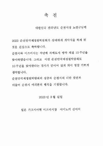 ¼øÃµ½ÃÀÇ Àڸŵµ½ÃÀÎ ÀϺ» ÀÌÁî¹Ì½Ã ½ÃÀå(½ÃÀ̳ëŰ ½ÅÀÌÄ¡)Àº ¡°10³â ¸¸¿¡ ´Ù½Ã °³ÃֵǴ ¼øÃµ¸¸±¹Á¦Á¤¿ø¹Ú¶÷ȸ¸¦ Áø½ÉÀ¸·Î ÃàÇÏÇÑ´Ù¡±¶ó¸ç Àڸŵµ½Ã·Î½á Á¤¿ø¹Ú¶÷ȸ ¼º°ø °³ÃÖ¸¦ ¿°¿øÇÏ´Â ¼Çѹ®À» ¼øÃµ½Ã¿¡ º¸³»¿Ô´Ù.