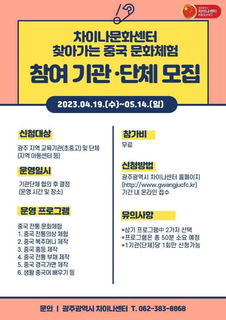 ±¤ÁÖ Â÷À̳ª¼¾ÅÍ ¡®Ã£¾Æ°¡´Â Áß±¹¹®ÈüÇ衯À» Èñ¸ÁÇÏ´Â Çб³³ª ´Üü´Â ±¤ÁÖ±¤¿ª½Ã Â÷À̳ª¼¾ÅÍ È¨ÆäÀÌÁö(http://www.gwangjucfc.kr)¸¦ ÅëÇØ ½ÅûÇϰųª, ±¤ÁÖ±¤¿ª½Ã Â÷À̳ª¼¾ÅÍ(062-383-8868)·Î ¹®ÀÇÇÏ¸é µÈ´Ù.