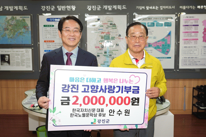 °Áø±ºÀº Çѱ¹ÀÚÄ¡½Å¹®ÀÇ ´ëÇ¥ÀÌÀÚ ³ëº§¹®Çлó È帷Π¼±Á¤µÈ ¾È¼ö¿ø ȸÀåÀÌ °íÇâ»ç¶û±âºÎ±Ý 200¸¸ ¿øÀ» ±âŹÇß´Ù°í 20ÀÏ ¹àÇû´Ù.