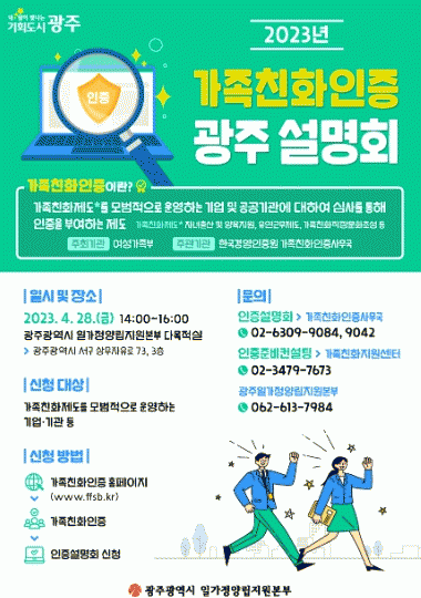 °¡Á·Ä£ÈÀÎÁõ ¼³¸íȸ´Â À¯¿¬±Ù¹«Á¦, Á¤½ÃÅð±Ù, À°¾ÆÈÞÁ÷ µî °¡Á·Ä£ÈÁ¦µµ¸¦ ¸ð¹üÀûÀ¸·Î ¿î¿µÇÏ´Â ±â¾÷¡¤±â°üÀ» ´ë»óÀ¸·Î ¿©¼º°¡Á·ºÎ°¡ ºÎ¿©ÇÏ´Â ¡®°¡Á·Ä£ÈÀÎÁõÁ¦µµ¡¯ÀÇ ½É»ç±âÁØ µî ¼¼ºÎÇ׸ñ¿¡ ´ëÇÑ Á¤º¸¸¦ Á¦°øÇÑ´Ù.
