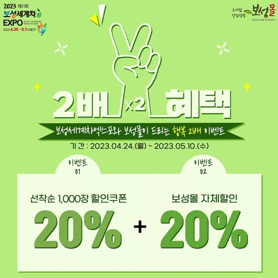À̹ø Ưº° ÇÒÀÎ Çà»ç´Â 4¿ù 29ÀϺÎÅÍ 5¿ù 7ÀϱîÁö ¿¸®´Â ¡®2023 º¸¼º¼¼°èÂ÷¿¢½ºÆ÷¡¯ ¼º°ø °³ÃÖ¸¦ À§ÇØ Â÷¿Í Â÷ ¿¬°ü Á¦Ç°¿¡ ÇÑÇØ ÁøÇàµÈ´Ù. º¸¼º¸ô ÀÚü ÇÒÀÎ 20%¿¡ Àü¶ó³²µµ ½Ã±º ³ó¼öÃà»ê¹° ÆÇÃË ±âȹÀü ÇÒÀÎ 20%¸¦ ´õÇÑ 40% ÆÄ°Ý ÇÒÀÎ Çà»çÀÌ´Ù.