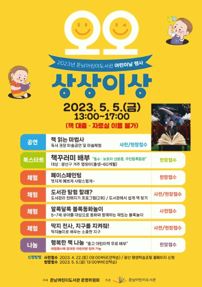 µ¶¼ ±ÇÀå ¸¶¼ú°ø¿¬ ¡®Ã¥ Àд ¸¶¹ý»ç¡¯, µµ¼°ü ŽÇè, ºí·Ïµ¿È ³îÀÌ, ¾ó±¼ ±×¸²(ÆäÀ̽ºÆäÀÎÆÃ), µüÁö ³îÀÌ µî ´Ù¾çÇÑ ÇÁ·Î±×·¥À» ¿î¿µÇÑ´Ù. ÇÁ·Î±×·¥ Âü¿©ÀÚ¿¡°Ô´Â ¿î³²¾î¸°À̵µ¼°ü ¿î¿µÀ§¿øÈ¸°¡ ±¸ÀÔÇÑ ¾î¸°ÀÌÃ¥À» °¡Áú ¼ö ÀÖ´Â ¡®ÇູÇÑ Ã¥ ³ª´®¡¯ Âü¿© ±âȸ°¡ ÁÖ¾îÁø´Ù.