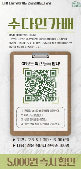 ¡®¼ö´ÙÀΰ¡¹è¡¯´Â ´ã¾ç±º ³» 12°÷ÀÇ Çù·Â Ä«Æä¸¦ °ÅÁ¡À¸·Î ÁøÇàµÇ¸ç, Ä«Æä¿¡ ¹æ¹®ÇÑ Áö¿ª¹Î°ú ¹æ¹®°´µéÀº QRÄڵ带 ÅëÇØ ¼³¹®¿¡ Âü¿©Çϰí, Âü¿© ÈÄ Ä«Æä Ãø¿¡ ¿Ï·á ÀÎÁõÀ» ¹ÞÀº ¼±Âø¼ø 1,200¸í¿¡°Ô´Â °¢ 5,000¿ø ÇÒÀÎ ÇýÅÃÀ» Á¦°øÇÑ´Ù.