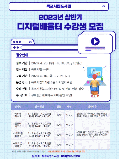 À̹ø °Á´ ÄÄÇ»ÅÍ ±âÃÊ, ½º¸¶Æ® Æù Ȱ¿ë µî 2°³ °Á 4°³ °úÁ¤À» Àü¹® °»ç¿Í ÇÔ²² 5¿ù 16ÀϺÎÅÍ 7¿ù 21ÀϱîÁö ÃÑ 10ÁÖ°£ ¸ñÆ÷½Ã¸³µµ¼°ü 3Ãþ µðÁöÅÐÀÚ·á½Ç¿¡¼ ¿î¿µµÈ´Ù.