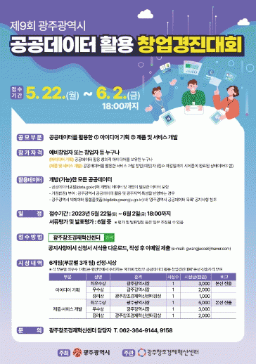 Âü°¡ Èñ¸ÁÀÚ´Â ±¤ÁÖ½Ã¿Í ±¤ÁÖâÁ¶°æÁ¦Çõ½Å¼¾ÅÍ È¨ÆäÀÌÁö, ±¤Áֽà ºòµ¥ÀÌÅÍ ÅëÇÕÇ÷§Æû¿¡ °Ô½ÃµÈ °ø°í¸¦ Âü°íÇØ 5¿ù 22ÀϺÎÅÍ 6¿ù 2ÀϱîÁö ÀüÀÚ¿ìÆí(À̸ÞÀÏ)À¸·Î¸¸ ½ÅûÇÒ ¼ö ÀÖ´Ù. ¼·ù ¹× ¹ßÇ¥ Æò°¡¸¦ °ÅÃÄ 6¿ù 28ÀÏ ±¤ÁÖ±¤¿ª½ÃÀå»ó µî 6°³ÀÇ ¿ì¼öÀÛÀ» ¼±Á¤Çϰí, ÃÑ»ó±Ý 1600¸¸¿øÀ» ¼ö¿©ÇÒ ¿¹Á¤ÀÌ´Ù.
