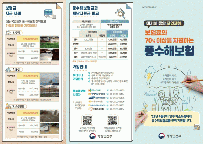dz¼öÇØº¸ÇèÀº ÅÂdz, È«¼ö, È£¿ì, °Ç³, dz¶û, ÇØÀÏ, ´ë¼³, ÁöÁø(ÁöÁøÇØÀÏ Æ÷ÇÔ) µî ÀÚ¿¬ÀçÇØ¿¡ µû¶ó ¹ß»ýÇÏ´Â ÇÇÇØ¸¦ º¸»óÇÏ´Â Á¤Ã¥º¸ÇèÀ¸·Î ÇàÁ¤¾ÈÀüºÎ°¡ °üÀåÇϰí 7°³ ¹Î¿µº¸Çè»ç°¡ ¿î¿µÇÑ´Ù. Àú·ÅÇÑ º¸Çè·á·Î ¿¹±âÄ¡ ¸øÇÑ Ç³¼öÇØ¿¡ ½º½º·Î ´ëºñÇØ ÇÇÇØ ¹ß»ý ½Ã Çö½ÇÀûÀÎ º¸»óÀÌ ÀÌ·ïÁú °ÍÀ¸·Î ±â´ëµÈ´Ù.
