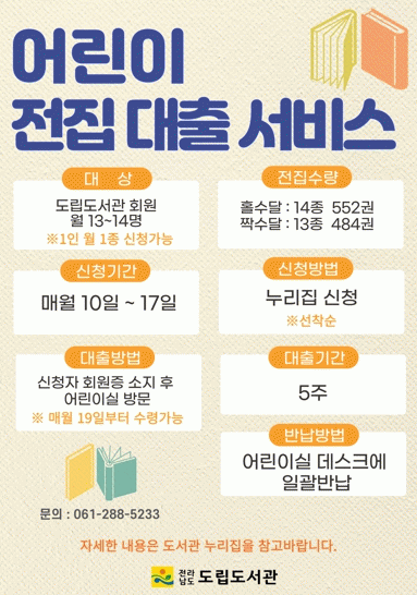 ¡®¾î¸°ÀÌ ÀüÁý ´ëÃâ ¼ºñ½º¡¯´Â Àü³²µµ¸³µµ¼°ü ´©¸®ÁýÀ» ÅëÇØ ½ÅûÇÏ¸é µÈ´Ù. ¸Å¿ù 10ÀϺÎÅÍ µµ¸³µµ¼°ü ȸ¿øÀ» ´ë»óÀ¸·Î ½Åû¹Þ´Â´Ù. 13~14¸íÀ» ¼±Âø¼øÀ¸·Î ¼±Á¤ÇØ 19ÀϺÎÅÍ ÀüÁýÀ» ´ë¿©Çϸç 5ÁÖ µ¿¾È ÀÌ¿ëÇÒ ¼ö ÀÖ´Ù.