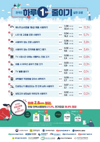 ¡®ÇÏ·ç 1kWh ÁÙÀ̱⡯´Â ¡ã»ç¿ëÇÏÁö ¾Ê´Â Á¶¸íÀ» ²ô°í Ç÷¯±× »Ì±â(0.6kWh/ÀÏ) ¡ã¹ß±¤´ÙÀÌ¿Àµå(LED) µî °íÈ¿À² Á¶¸í »ç¿ë(0.5kWh/ÀÏ) ¡ã³ÃÀå°í ³ÃÀå½Ç 20% ºñ¿ì±â(0.1kWh/ÀÏ) ¡ã¿¡³ÊÁö È¿À² 1µî±Þ Á¦Ç° »ç¿ë(1.1kWh/ÀÏ) µîÀ» ÅëÇØ ½ÇõÇÒ ¼ö ÀÖ´Ù.