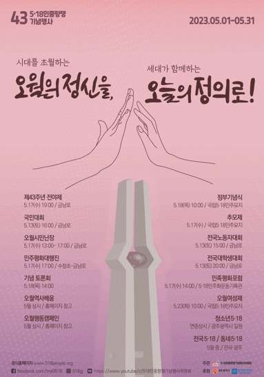 5¡¤18 Áø»ó±Ô¸í, Ã¥ÀÓÀÚ Ã³¹ú, Çå¹ýÀü¹® ¼ö·Ï, ¿ª»ç¿Ö°î ´ëÀÀÀÇ °úÁ¦¸¦ ¾È°í ¸Â´Â Á¦43Áֳ⠱â³äÇà»ç¸¦ 5¡¤18Á¤½ÅÀ» °è½ÂÇÏ°í ¹Ì·¡ ¼¼´ë¿Í ÇÔ²² ÇöÀçÀÇ À§±â¸¦ ±Øº¹ÇÏÀÚ´Â ±âÁ¶¿Í ¹æÇâÀ» ´ã¾Ò´Ù.