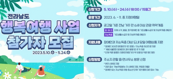ÀÌ »ç¾÷Àº ½Åü?°æÁ¦Àû ¿©°ÇÀ¸·Î ÀÎÇØ °ü±¤È°µ¿ÀÌ ¾î·Á¿î Ãë¾à°èÃþÀÇ °ü±¤º¹Áö ½ÇÇöÀ» À§ÇØ Àú¼ÒµæÃþ¿¡°Ô´Â 1Àδç 15¸¸ ¿ø, °Åµ¿ÀÌ ºÒÆíÇÑ Àå¾ÖÀÎÀÇ °æ¿ì µ¿¹ÝÀÚ 1ÀÎÀ» Æ÷ÇÔÇØ 30¸¸ ¿ø »ó´çÀÇ ¿©ÇàȰµ¿ºñ¸¦ Áö¿øÇÏ´Â »ç¾÷ÀÌ´Ù.