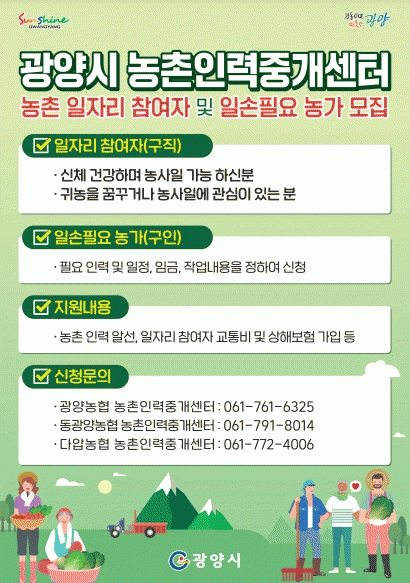 ÀϼÕÀÌ ÇÊ¿äÇÑ ³ó°¡¿Í ³óÀÛ¾÷ Âü¿©¸¦ Èñ¸ÁÇÏ´Â ±¸Á÷ÀÚ´Â ±¤¾ç³óÇù, µ¿±¤¾ç³óÇù, ´Ù¾Ð³óÇù ³óÃÌÀηÂÁß°³¼¾ÅÍ¿¡ ½ÅûÇÏ¸é µÈ´Ù.