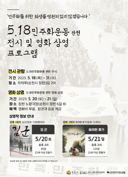 ¿À´Â 18ÀϺÎÅÍ 31ÀϱîÁö´Â Â÷Â÷·ç¿¡¼ 5¡¤18 °ü·Ã »çÁøÀüÀÌ ÁøÇàµÇ°í 20ÀϺÎÅÍ ÀÌÆ²°£Àº Àåõ ³ë¶û±ØÀå¿¡¼´Â ¿µÈ¸¦ ¹«·á·Î »ó¿µÇÑ´Ù.